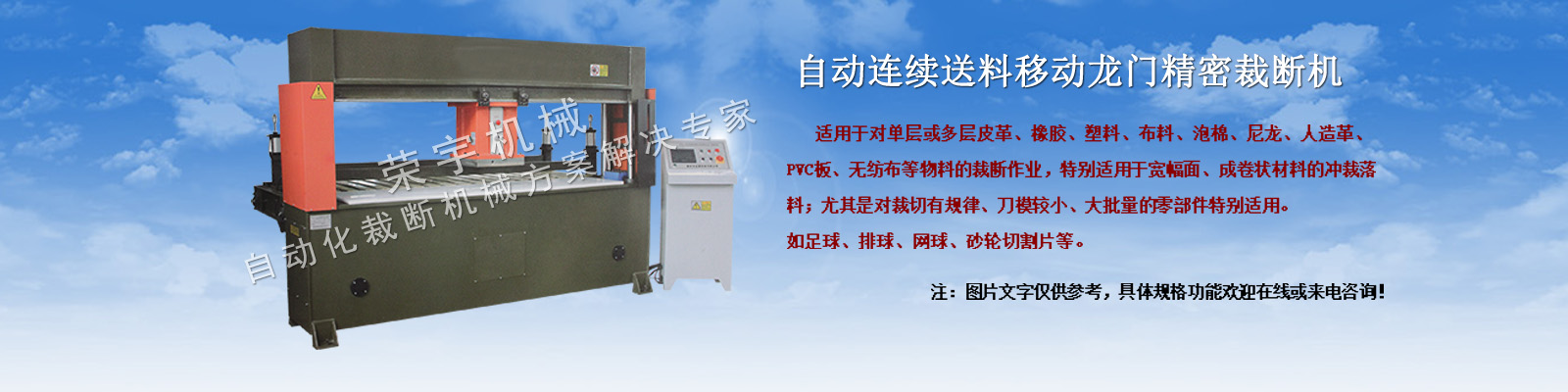 盐城荣宇机械有限公司座落在美丽富饶的黄海之滨—盐城,是我国皮革、制鞋、橡塑、箱包、手套、体育用品、汽车用品、服装等行业用裁断、下料、切条、拉布铺布、压花复合机械专业研制生产的企业。